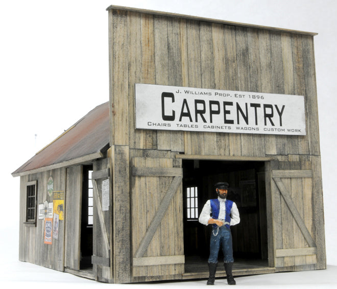The kit is composed of a laser cut masonite core overlaid with pine strip wood. Silkspan tissue is included for the roof along with a styrene tube for the chimney. The structure also includes a masonite floor. The interior structure is tabbed and slotted for easy fit construction. Overall foot print is 8 1/2" wide by 13" deep. Includes signs, figure not included....